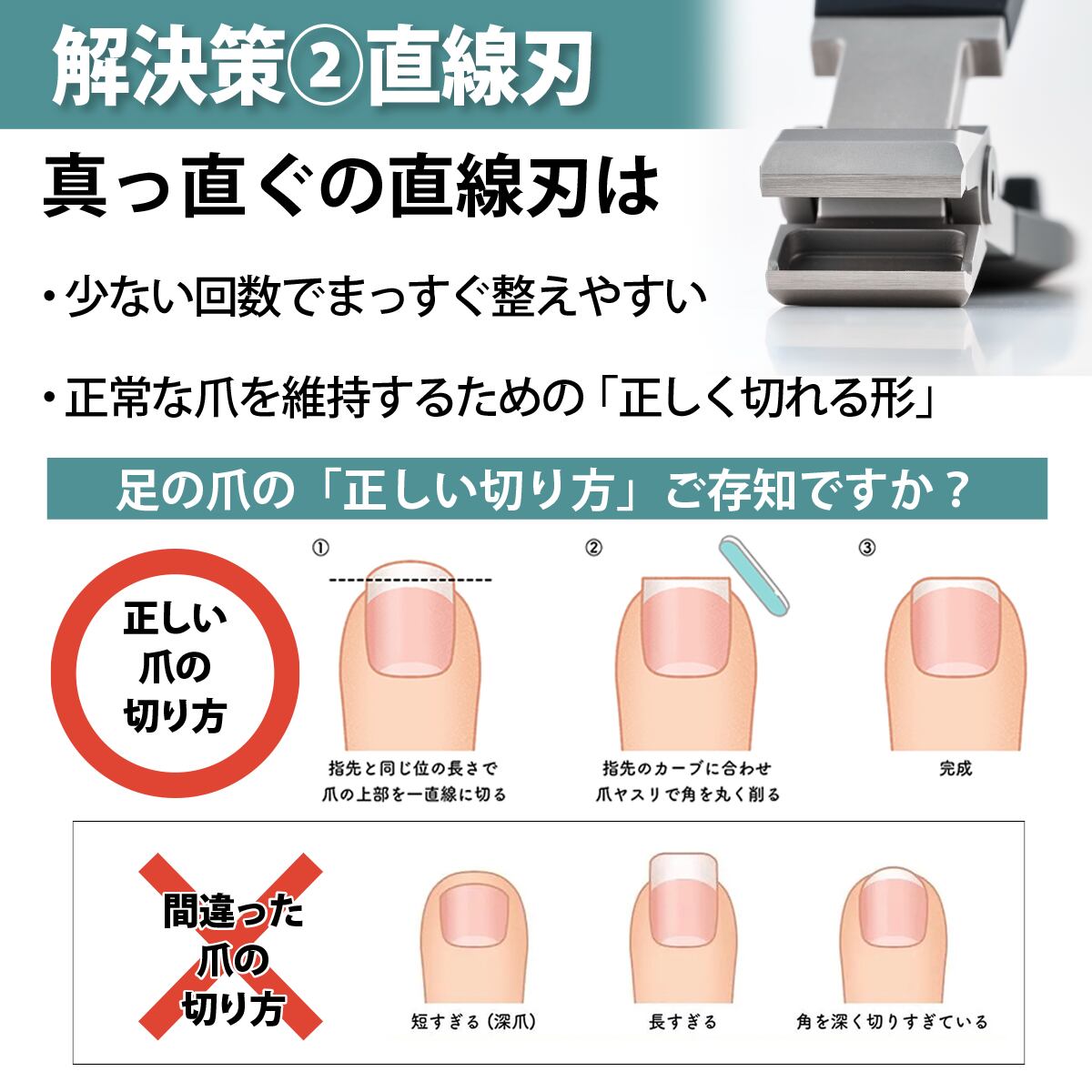 ●巻き爪の基本は「まっすぐ切る」。 直線刃 × ワイド開口で、正しく整えやすい足専用設計。